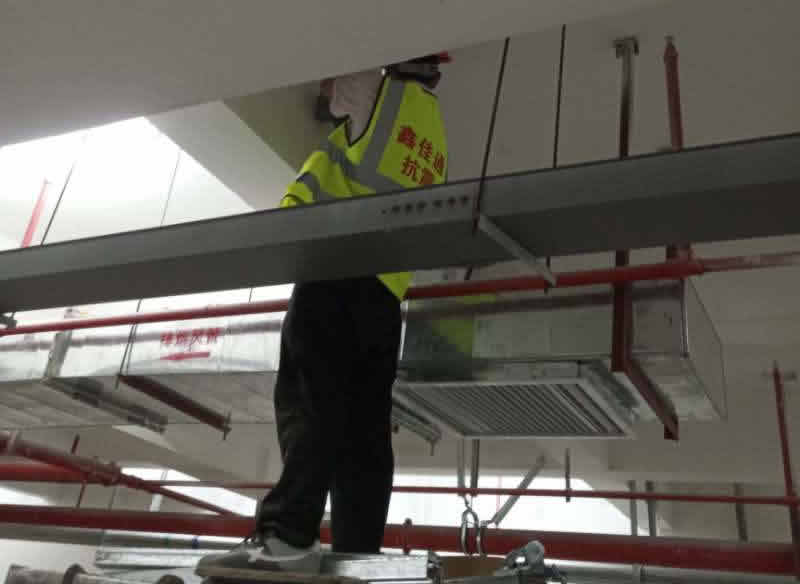 3、安裝抗震支架的時候,預(yù)先可在地面上把干管和支管分段連接好,根據(jù)吊裝情況和連接情況,直管每段長度約為10m左右。法蘭之間要加上墊片,連接法蘭的螺栓及螺帽應(yīng)在同一側(cè)。安裝前,應(yīng)檢查支吊架是否牢固、準(zhǔn)確。高空作業(yè)時,吊裝的繩應(yīng)綁扎結(jié)實,待與配件連接牢固,并通過支架找平固定后方可松開。垂直可從下向上一節(jié)一節(jié)的吊裝連接,安裝后用線錘找正。