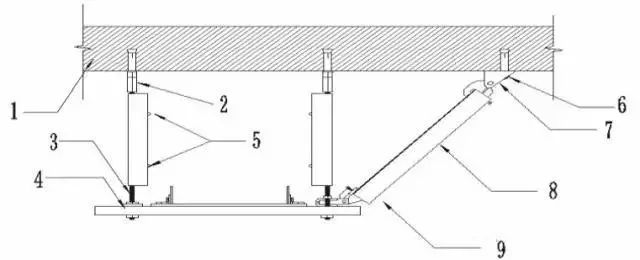6- 膨脹螺栓;7- 抗震連接構(gòu)件;8- 槽鋼;9- 快速抗震連接構(gòu)件