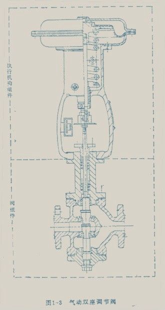 調(diào)節(jié)閥一般由執(zhí)行機(jī)構(gòu)和閥組件兩個(gè)部分組成。在有些場合可帶有閥門定位器、手輪機(jī)構(gòu)等附件。調(diào)節(jié)閥中最典型的產(chǎn)品——?dú)鈩与p座調(diào)節(jié)閥的結(jié)構(gòu)如圖1-3所示。