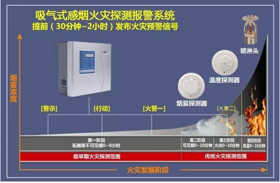 火災(zāi)的發(fā)展分為四個(gè)階段:萌芽(不可見煙霧)、可見煙霧,火焰和高熱階段。上圖表示了在一定時(shí)間內(nèi)火災(zāi)的不同發(fā)展階段。注意在火災(zāi)在萌芽期的醞釀階段提供了更多的時(shí)間與機(jī)會來探測并控制火災(zāi)的發(fā)展。