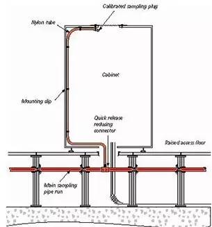 吸氣式感煙火災(zāi)探測器的采樣管路配置相當(dāng)靈活,采樣管可以配置在機(jī)柜上方,利用軟管及機(jī)柜上方的開孔即可抽取機(jī)柜內(nèi)部的空氣。采樣管路也可以配置在機(jī)柜下方,利用軟管延伸到機(jī)柜內(nèi)部的頂端來抽取空氣樣本。